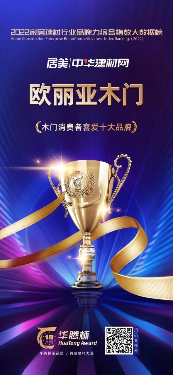 2022年,欧丽亚木门在乐竞在线注册品质、绿色环保、时尚创新、售后服务等方面广受消费者的认可和喜爱。9月1日,欧丽亚在由中华建材网举办的“2022年“华腾杯”家居建材行业品牌力综合指数大数据榜评比活动”中荣获